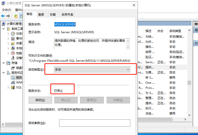 1.1.1 此电脑--管理-- 服务 -- sql server(MESSQLSERVER) -- 右键“停止” --右键“属性” -- 服务状态--“已停止” -- 启动类型:(设置为--手动 ;自动代表开机就启动服务)