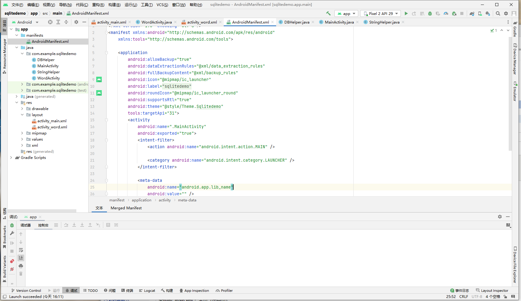 <?xml version="1.0" encoding="utf-8"?> <manifest xmlns:android="http://schemas.android.com/apk/res/android" xmlns:tools="http://schemas.android.com/tools"> <application android:allowBackup="true" android:dataExtractionRules="@xml/data_extraction_rules" android:fullBackupContent="@xml/backup_rules" android:icon="@mipmap/ic_launcher" android:label="@string/app_name" android:roundIcon="@mipmap/ic_launcher_round" android:supportsRtl="true" android:theme="@style/Theme.Sqlitedemo" tools:targetApi="31"> <activity android:name=".MainActivity" android:exported="true"> <intent-filter> <action android:name="android.intent.action.MAIN" /> <category android:name="android.intent.category.LAUNCHER" /> </intent-filter> <meta-data android:name="android.app.lib_name" android:value="" /> </activity> <activity android:name=".WordActivity" /> </application> </manifest>