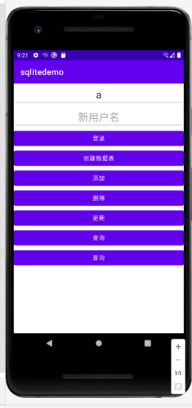 <?xml version="1.0" encoding="utf-8"?> <LinearLayout xmlns:android="http://schemas.android.com/apk/res/android" xmlns:app="http://schemas.android.com/apk/res-auto" xmlns:tools="http://schemas.android.com/tools" android:layout_width="match_parent" android:layout_height="match_parent" tools:context=".MainActivity" android:orientation="vertical"> <EditText android:id="@+id/tv_username" android:layout_width="match_parent" android:layout_height="wrap_content" android:hint="用户名" android:text="a" android:textSize="25dp" android:gravity="center" /> <EditText android:id="@+id/tv_usernamenew" android:layout_width="match_parent" android:layout_height="wrap_content" android:hint="新用户名" android:textSize="25dp" android:gravity="center" /> <!-- 注册--> <Button android:id="@+id/btn_login" android:layout_width="match_parent" android:layout_height="wrap_content" android:text="登录"/> <!-- 创建数据表--> <Button android:id="@+id/btn_registe" android:layout_width="match_parent" android:layout_height="wrap_content" android:text="创建数据表"/> <!-- 添加用户--> <Button android:id="@+id/btn_add" android:layout_width="match_parent" android:layout_height="wrap_content" android:text="添加"/> <!-- 删除--> <Button android:id="@+id/btn_delete" android:layout_width="match_parent" android:layout_height="wrap_content" android:text="删除"/> <!-- 更新用户--> <Button android:id="@+id/btn_update" android:layout_width="match_parent" android:layout_height="wrap_content" android:text="更新"/> <!-- 查询用户--> <Button android:id="@+id/btn_query" android:layout_width="match_parent" android:layout_height="wrap_content" android:text="查询"/> <!--跳转--> <Button android:id="@+id/btn_gotopage" android:layout_width="match_parent" android:layout_height="wrap_content" android:text="查询"/> </LinearLayout>