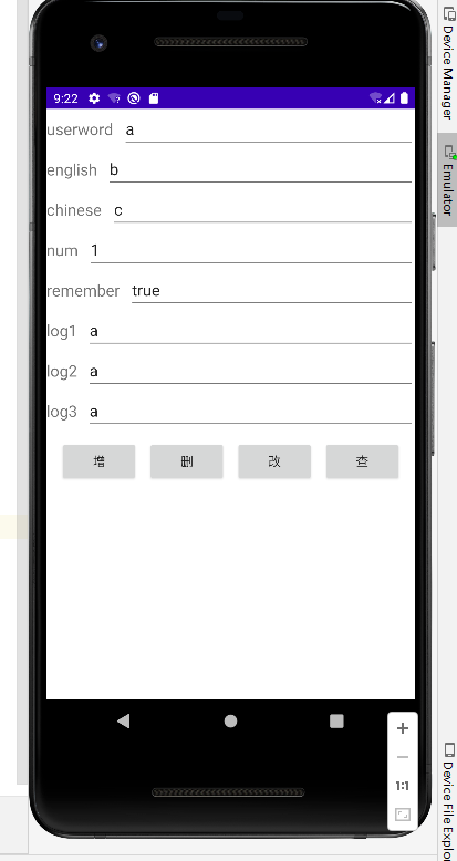 <?xml version="1.0" encoding="utf-8"?> <RelativeLayout xmlns:android="http://schemas.android.com/apk/res/android" android:layout_width="match_parent" android:layout_height="match_parent" android:orientation="vertical"> <LinearLayout android:layout_width="fill_parent" android:layout_height="wrap_content" android:layout_alignParentTop="true" android:layout_centerHorizontal="true" android:orientation="vertical" > <!-- <LinearLayout--> <!-- android:layout_width="match_parent"--> <!-- android:layout_height="wrap_content"--> <!-- android:layout_gravity="center"--> <!-- android:gravity="left"--> <!-- android:orientation="horizontal" >--> <!-- <TextView--> <!-- android:id="@+id/tv_id"--> <!-- android:layout_width="wrap_content"--> <!-- android:layout_height="match_parent"--> <!-- android:layout_gravity="center"--> <!-- android:gravity="center"--> <!-- android:text="id"--> <!-- android:textSize="18sp" />--> <!-- <EditText--> <!-- android:id="@+id/ed_id"--> <!-- android:layout_width="match_parent"--> <!-- android:layout_height="match_parent"--> <!-- android:layout_marginLeft="10dp"--> <!-- android:inputType="text"--> <!-- android:textSize="18sp"--> <!-- android:textStyle="normal"--> <!-- android:typeface="normal" >--> <!-- <!–光标定位到此–>--> <!-- <requestFocus />--> <!-- </EditText>--> <!-- </LinearLayout>--> <LinearLayout android:layout_width="match_parent" android:layout_height="wrap_content" android:layout_gravity="center" android:gravity="left" android:orientation="horizontal" > <TextView android:id="@+id/tv_userword" android:layout_width="wrap_content" android:layout_height="match_parent" android:layout_gravity="center" android:gravity="center" android:text="userword" android:textSize="18sp" /> <EditText android:id="@+id/ed_userword" android:layout_width="match_parent" android:layout_height="match_parent" android:layout_marginLeft="10dp" android:inputType="text" android:textSize="18sp" android:textStyle="normal" android:typeface="normal" > </EditText> </LinearLayout> <LinearLayout android:layout_width="match_parent" android:layout_height="wrap_content" android:layout_gravity="center" android:gravity="left" android:orientation="horizontal" > <TextView android:id="@+id/tv_english" android:layout_width="wrap_content" android:layout_height="match_parent" android:layout_gravity="center" android:gravity="center" android:text="english" android:textSize="18sp" /> <EditText android:id="@+id/ed_english" android:layout_width="match_parent" android:layout_height="match_parent" android:layout_marginLeft="10dp" android:text="b" android:textStyle="normal" android:typeface="normal" > </EditText> </LinearLayout> <LinearLayout android:layout_width="match_parent" android:layout_height="wrap_content" android:layout_gravity="center" android:gravity="left" android:orientation="horizontal" > <TextView android:id="@+id/tv_chinese" android:layout_width="wrap_content" android:layout_height="match_parent" android:layout_gravity="center" android:gravity="center" android:text="chinese" android:textSize="18sp" /> <EditText android:id="@+id/ed_chinese" android:layout_width="match_parent" android:layout_height="match_parent" android:layout_marginLeft="10dp" android:textSize="18sp" android:text="c" android:textStyle="normal" android:typeface="normal" > </EditText> </LinearLayout> <LinearLayout android:layout_width="match_parent" android:layout_height="wrap_content" android:layout_gravity="center" android:gravity="left" android:orientation="horizontal" > <TextView android:id="@+id/tv_num" android:layout_width="wrap_content" android:layout_height="match_parent" android:layout_gravity="center" android:gravity="center" android:text="num" android:textSize="18sp" /> <EditText android:id="@+id/ed_num" android:layout_width="match_parent" android:layout_height="match_parent" android:layout_marginLeft="10dp" android:inputType="number" android:textSize="18sp" android:text="1" android:textStyle="normal" android:typeface="normal" > </EditText> </LinearLayout> <LinearLayout android:layout_width="match_parent" android:layout_height="wrap_content" android:layout_gravity="center" android:gravity="left" android:orientation="horizontal" > <TextView android:id="@+id/tv_remember" android:layout_width="wrap_content" android:layout_height="match_parent" android:layout_gravity="center" android:gravity="center" android:text="remember" android:textSize="18sp" /> <EditText android:id="@+id/ed_remember" android:layout_width="match_parent" android:layout_height="match_parent" android:layout_marginLeft="10dp" android:textSize="18sp" android:text="true" android:textStyle="normal" android:typeface="normal" > </EditText> </LinearLayout> <LinearLayout android:layout_width="match_parent" android:layout_height="wrap_content" android:layout_gravity="center" android:gravity="left" android:orientation="horizontal" > <TextView android:id="@+id/tv_log1" android:layout_width="wrap_content" android:layout_height="match_parent" android:layout_gravity="center" android:gravity="center" android:text="log1" android:textSize="18sp" /> <EditText android:id="@+id/ed_log1" android:layout_width="match_parent" android:layout_height="match_parent" android:layout_marginLeft="10dp" android:text="a" android:textSize="18sp" android:textStyle="normal" android:typeface="normal" > </EditText> </LinearLayout> <LinearLayout android:layout_width="match_parent" android:layout_height="wrap_content" android:layout_gravity="center" android:gravity="left" android:orientation="horizontal" > <TextView android:id="@+id/tv_log2" android:layout_width="wrap_content" android:layout_height="match_parent" android:layout_gravity="center" android:gravity="center" android:text="log2" android:textSize="18sp" /> <EditText android:id="@+id/ed_log2" android:layout_width="match_parent" android:layout_height="match_parent" android:layout_marginLeft="10dp" android:text="a" android:textSize="18sp" android:textStyle="normal" android:typeface="normal" > </EditText> </LinearLayout> <LinearLayout android: