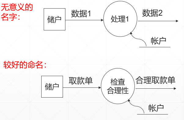 如果难以为DFD图中的成分(数据流、加工等)命名,往往说明分解不当, 可考虑重新分解。