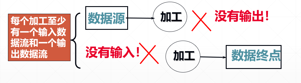 1)某个加工输出的数据并无相应的数据来源,可能是某些数据流被遗漏了。