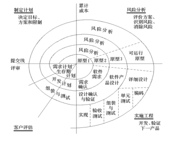 特点:瀑布模型(系统化)+快速原型(迭代过程)+风险分析;