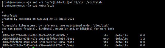4、删除/etc/fstab文件中所有以#开头,后面至少跟一个空白字符的行的行首的#和空白字符