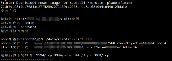 脚本运行完成后,会在 ./data/zerotier/dist 目录下生成 planet 和 moon 配置文件。