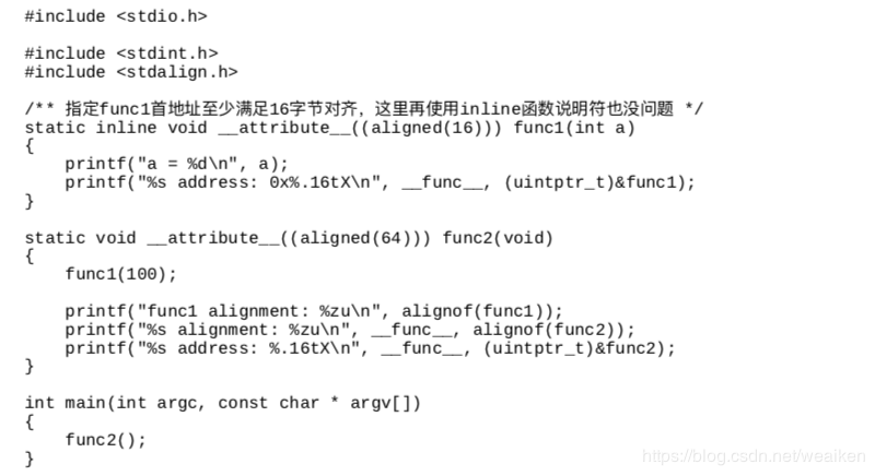 aligned 属性修饰一个函数时,用于直至该函数的首地址至少需要 aligned 个字节对齐。