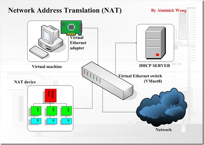 仔细的上图与”主机模式下的网络模型图”后,你应该就明白了“主机模式”下为什么不能访问外网了。 对于nat模式,上面的图已经解释够多了,这次就少说一点。 在NAT模式下,相当于重新在原来网络的基础上又分了一层子网,因些我们可以为虚拟机来指定ip地址,从而固定ip。