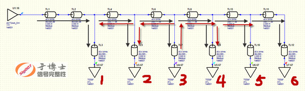 咱先从理论上看看这个拓扑中会发生什么。芯片的input buffer对信号来说通常表现出很高的阻抗,信号传输到接收芯片会发生反射。下图中6个接收端都会有反射。反射回来的信号遇到走线 分叉会分别进入两条岔路,比如从3反射回来的信号沿主干线向左右两个方向传输,传到1、2、4、5、6等接收器时再次发生反射。也就是3反射的信号会干扰其他芯片的接收信号。同样的,其他任何一个接收器的反射信号都会 干扰别的接收器。反射过程会发生很多次,延时叠加,反复的反射震荡,这是一个很复杂的过程,理论上简单,但最终会叠加出来一个神马东西?想不出来,得靠软件。