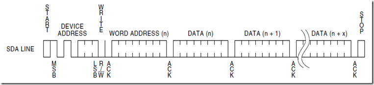单片机进行写操作时,首先发送该器件的7位地址码和写方向位”0”(共8位,即一个字节),发送完后释放SDA线并在SCL线上产生第9个时钟信号。被选中的存储器器件在确认是自己的地址后,在SDA线上产生一个应答信号作为响应,单片机收到应答后就可以传送数据了。传送数据时,单片机首先发送一个字节的被写入存储器的首地址,收到存储器器件的应答后,单片机就逐个发送数据字节,但每发送一个字节后都要等待应答。AT24C系列片内地址在接收到每一个数据字节地址后自动加1,在芯片的“一次装载字节数”限度内,只需输入首地址。装载字节数超过芯片的“一次装载字节数”时,数据地址将“上卷”,前面的数据将被覆盖。