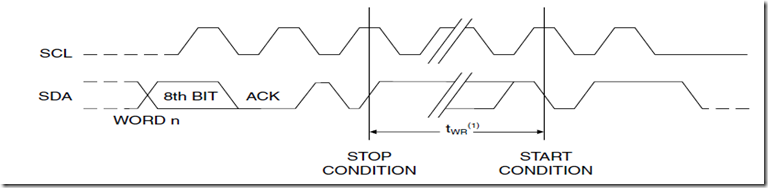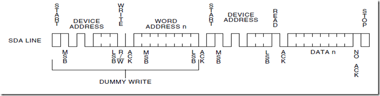 单片机先发送该器件的7位地址码和写方向位“0”(“伪写”),发送完后释放SDA线并在SCL线上产生第9个时钟信号。被选中的存储器器件在确认是自己的地址后,在SDA线上产生一个应答信号作为回应。