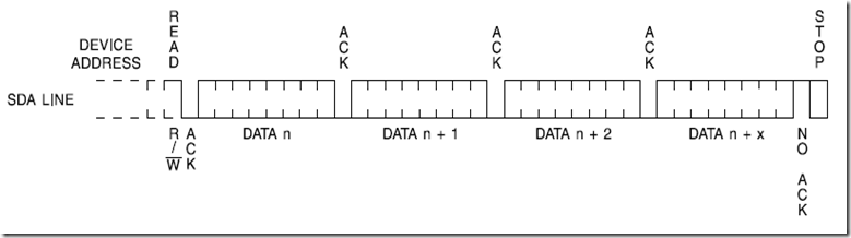然后,再发一个字节的要读出器件的存储区的首地址,收到应答后,单片机要重复一次起始信号并发出器件地址和读方向位(“1”),收到器件应答后就可以读出数据字节,每读出一个字节,单片机都要回复应答信号。当最后一个字节数据读完后,单片机应返回以“非应答”(高电平),并发出终止信号以结束读出操作。