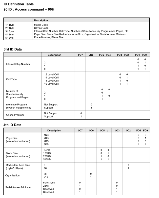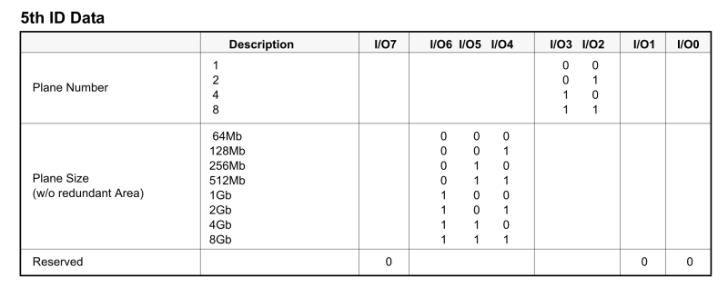 每顆nand chip 容量的相關值,可以透過”read id“這個命令讀出來,舊的格式有5bytes(目前常見),新的格式有8 bytes(目前找不到),下圖為舊格式bit field的定義