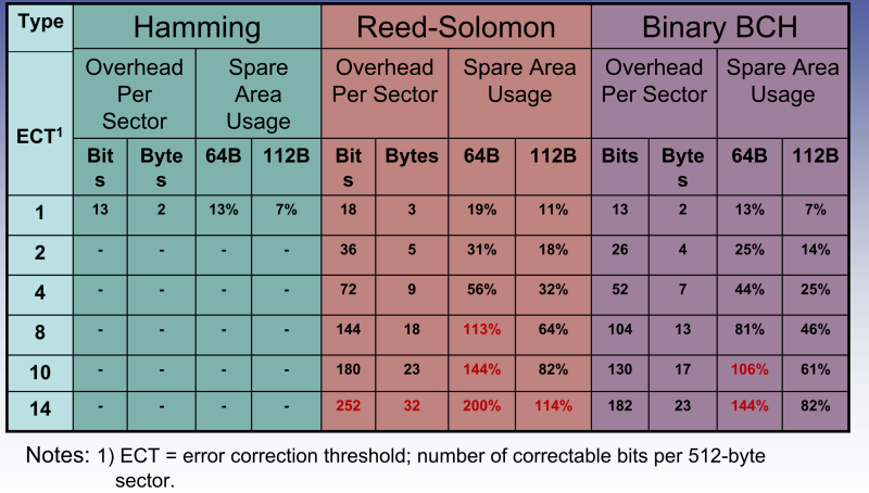 ECC即error correct code,因為無法預測什麼時候會發生bad block,sw上會對每個page做ecc的效正機制以防止資料錯誤,這些效正的資料的會被存在同一個page的oob裡,一般用的演算法有下列三種,每種有不同的效正能力也需要不同的ecc效正資訊,可參考下圖。另外隨著page size愈來愈大,對ECC的能力要求來愈來愈高,依innodisk 資料,硬碟型的產品,單一page ECC能力要求到7x bits