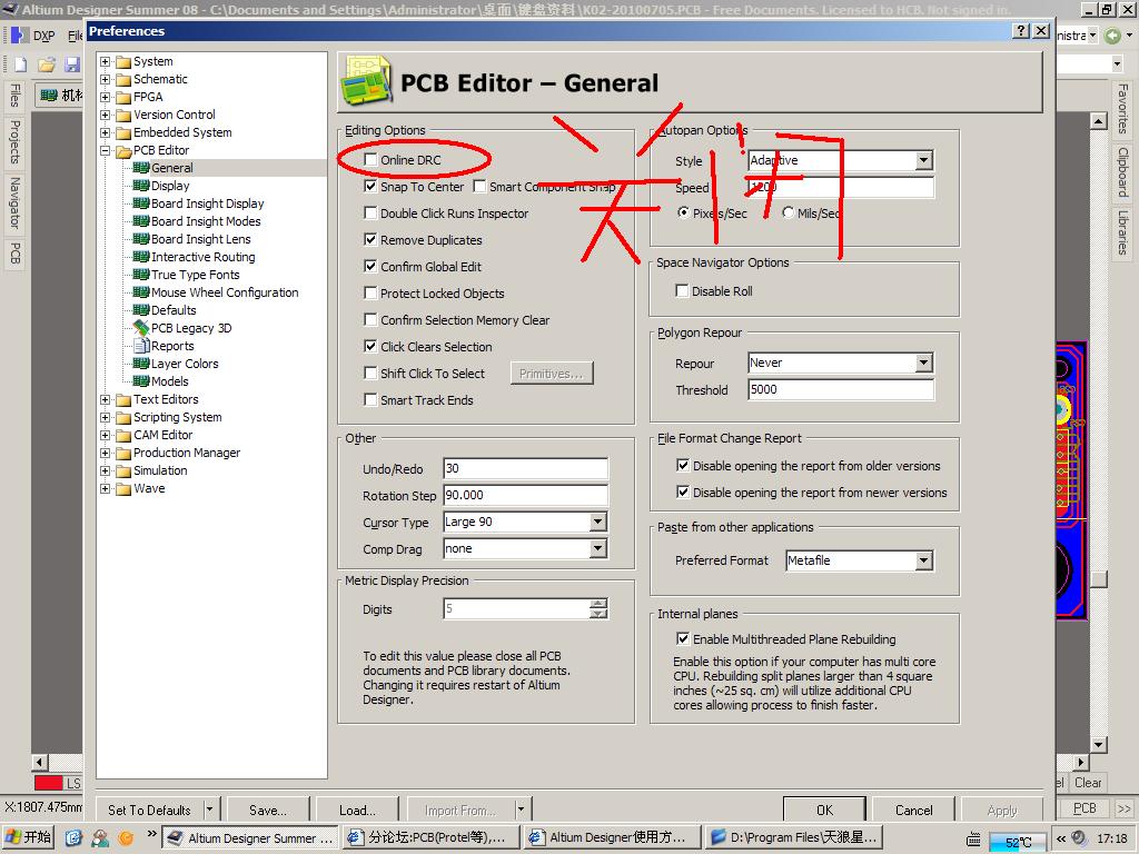 个人还是习惯在线DRC检查,如果关掉的话,即使后面有最终的检测,但一旦有错误存在也极有可能是毁灭性的,修改PCB牵一发而动全身。在线DRC就是把这种可能性扼杀在摇篮中。 至于占内存的问题至今没有遇到过(声明本人电脑一般,2G双通道内存),电脑性能不好的就没必要看此贴了。 |