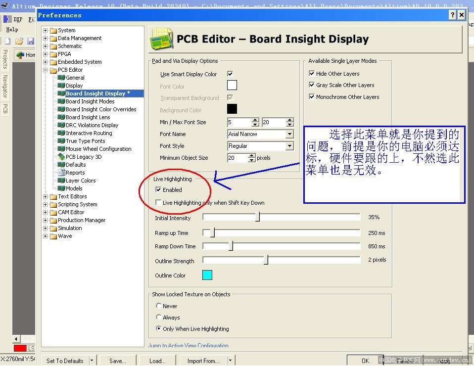 方法二 (原文件名:2.JPG) 是带放大镜检测的shift+M启动,分离用shift+N,这是方法二 视频ourdev_579315.rar(文件大小:7.70M) (原文件名:高亮网络检测.rar) 这是视频,以上方法均有演示,不好意识,就是没有声音。 还有一种方法就是原理图与pcb同步检测。 |