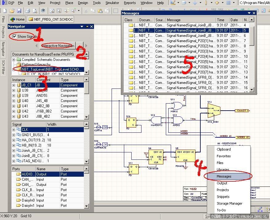 回复【56楼】pingufocpux ----------------------------------------------------------------------- 你好: 原理图检测是先用导航器(Navigator)分析,在消息(Messages)里面查看。请参照图片操作。