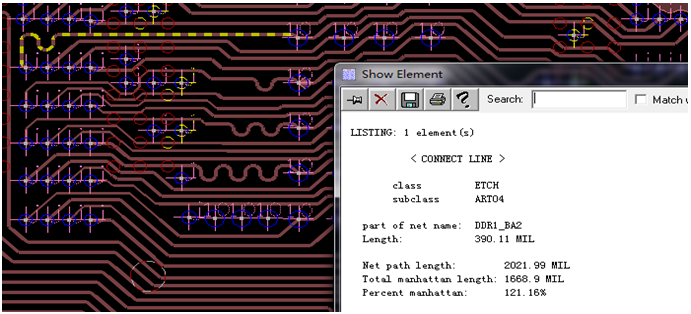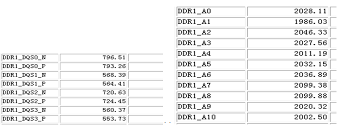 •地址信号平均总长度2000mil减掉一个分支长度400mil,大致可以知道主控到其中一个颗粒的长度在1600mil,而数据信号最短的长度才550mil,之间相差比较大,超过了1000mil。