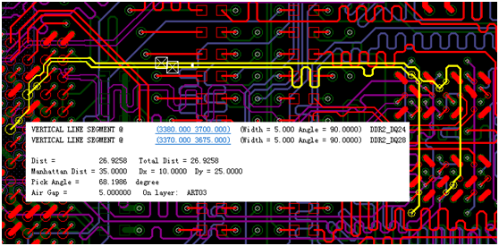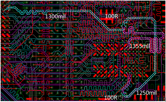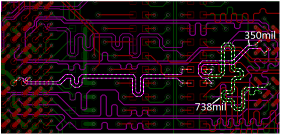 再来看DQS信号,如上图高亮玫红白点信号,进过一级分支各0ohm串阻经350mil和738mil的线路到表底层颗粒,其他的差异不大。