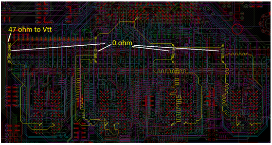 图中黄色高亮部分为地址信号走线,从主控芯片出来马上第一级分支,再约600mil进行第二级分支,再一个分支经过1000mil进行第三级分支,另一分支在50mil左右也开始第三级分支,最后接0ohm串阻约1100mil到颗粒,其中在最边上某一第三分支过孔处上拉一个47ohm电阻到Vtt,其他的地址、控制信号也大致如此结构。