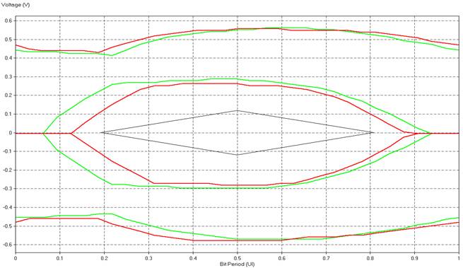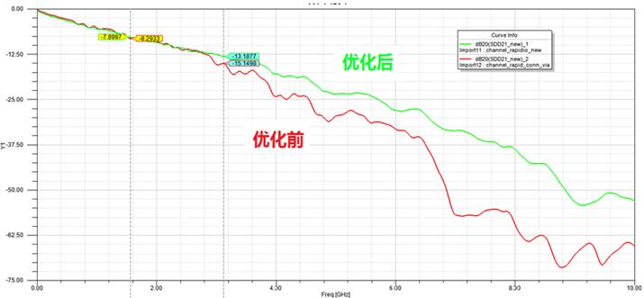 另外对过孔也进行一定的背钻等优化处理,分别提取优化前后单对通道(不考虑串扰)和多对通道的模型(考虑串扰),然后进行通道无源及有源眼图仿真,单通道的仿真结果对比如下图二和图三所示。