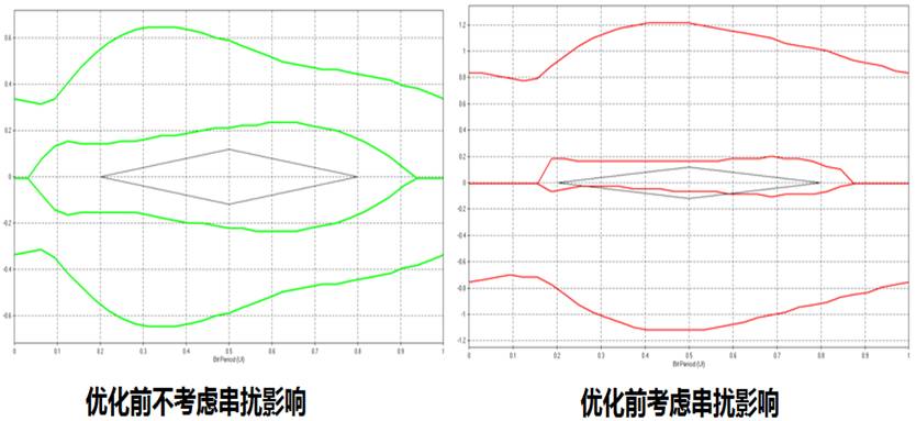 从以上单通道的仿真也可以说明,优化前虽然性能会差一点,但如果不考虑串扰的话单通道眼图还是满足要求的,这也可以解释插几个槽位还是可以工作的。我们再来仿真下考虑串扰的情况,仿真对比如下图四所示。