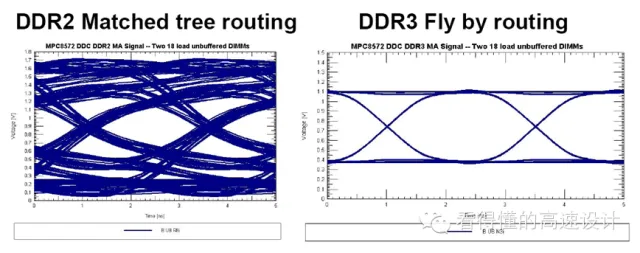 确实,这个要看情况。如果DDR3颗粒负载数量多的话(通常>4片),采用fly_by的拓扑结构信号质量总体会比T型结构好,但如果颗粒数量比较少(通常<4片),那么这2种拓扑的信号质量总体上就没有太大的差别,这个时候采用哪种拓扑就依个人所好了。下图三是同样接了18片颗粒的情况下最好信号的仿真眼图对比,采用fly_by的结果明显好于T型拓扑的结果。
