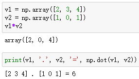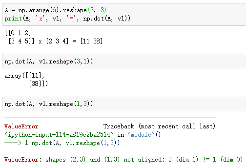 下面是一个常见的矩阵向量乘法例子,注意数组v1应被看作一个列向量。Numpy并不区分行向量和列向量,只是简单地校验维度是否符合矩阵乘法运算规则。在下例中,我们用一个2x3的矩阵和一个3维向量相乘,得到一个2维向量: