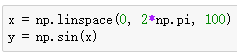 前面我们提到,numpy提供一整套作用于array上的数学函数,包括对数、指数、三角函数等。例如,在正弦函数上[0,2*pi]区间内均匀取100个样本点,可以用下面方法轻松实现: