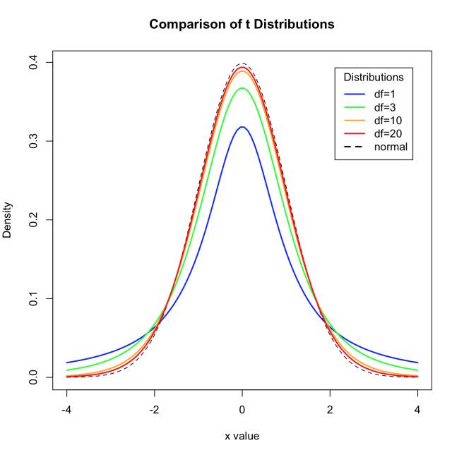 t分布曲线形态与n(确切地说与自由度df)大小有关。与标准正态分布曲线相比,自由度df越小,t分布曲线愈平坦,曲线中间愈低,曲线双侧尾部翘得愈高;自由度df愈大,t分布曲线愈接近正态分布曲线,当自由度df=∞时,t分布曲线为标准正态分布曲线。