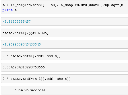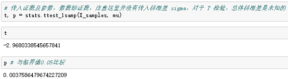 以上是整个计算过程细节,如果你不需要了解这些细节,那可以直接用 stats 模块中的单变量 T 检验 ttest_lsamp 来做这个事情。