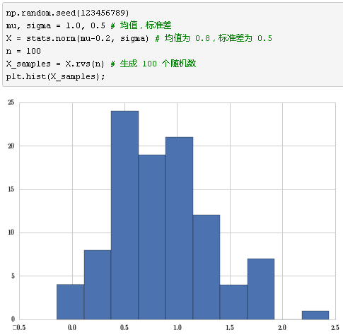 上面的采样数据真正的参数是,均值 0.8,标准差 0.5。我们假装不知道这些数据是由均值 0.8、标准差 0.5 的正态分布定义的,假装只知道这 100 个数字,那么我们的问题是,它们的分布参数的均值是不是 1 呢?