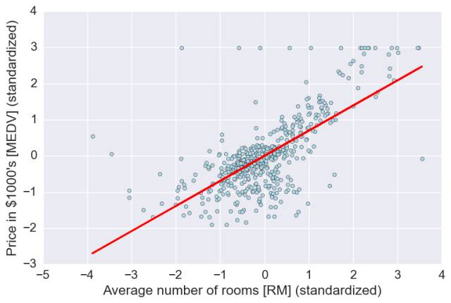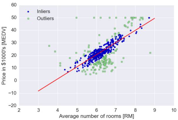 例如上次的波士顿房价预测问题,我们用最小二乘法建立了房间数[RM] vs 房价[MEDV]的线性回归模型,可以看出数据集中是有一些离群点的: