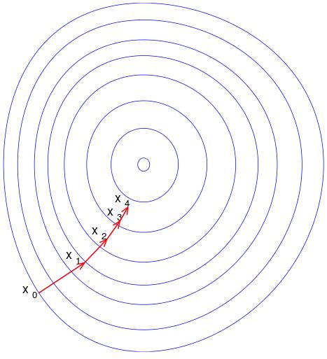 感知机学习转变成求解损失函数L(w,b)的最优化问题。最优化的方法是随机梯度下降法(stochastic gradient descent),这里采用的就是该方法。关于梯度下降的详细内容,参考wikipedia Gradient descent。下面给出一个简单的梯度下降的可视化图: