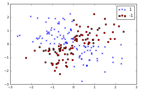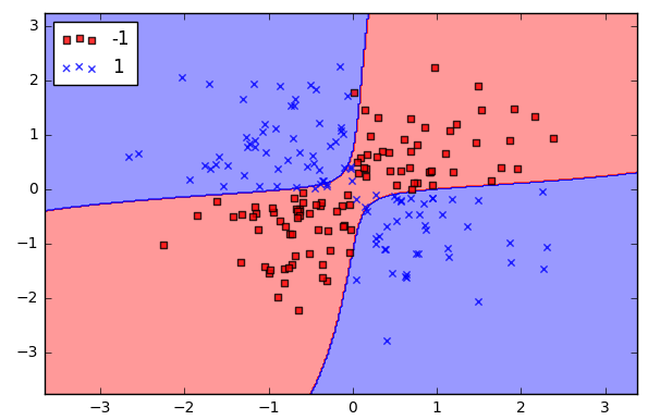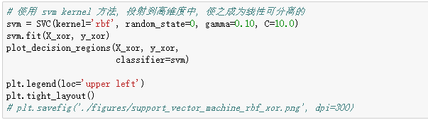 下面使用 svm kernel 方法, 投射到高维度中, 使之成为线性可分离的。rbf 是指 radial basis function kernel 或者 Gaussian kernel。