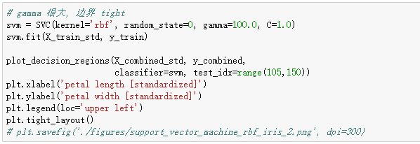 gamma parameter 可以被理解为 cut-off parameter for Gaussian sphere, gamma 增加, 也就增加了训练样本的影响, 也就会使决策边界变得模糊。