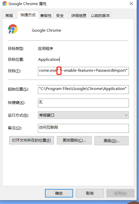 在目标中,输入 空格"--enable-features=PasswordImport",应用并确定
