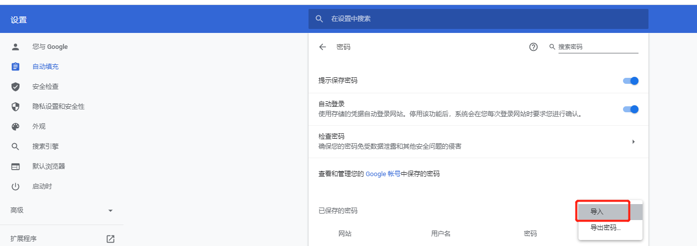 点击【已保存的密码】后的更多中的【导入】选项,选择文件后,导入即可