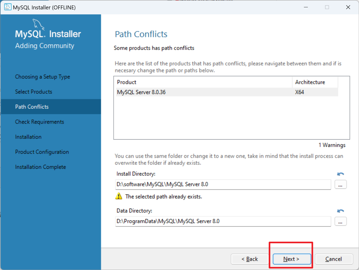 5、修改后点击【next】,path conflicts中确认信息,继续【next】
