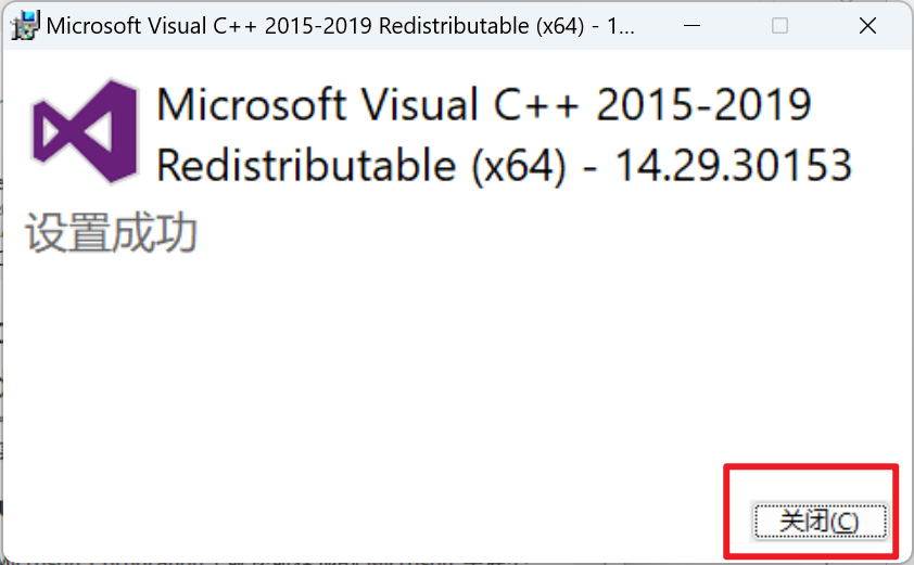 弹出安装弹窗后,同意协议并点击【安装】,成功后点击c++安装的【关闭】
