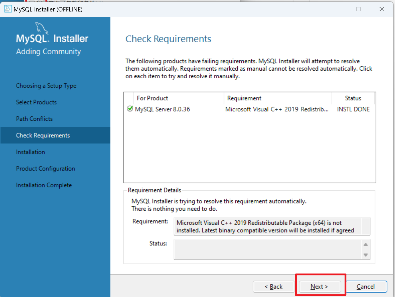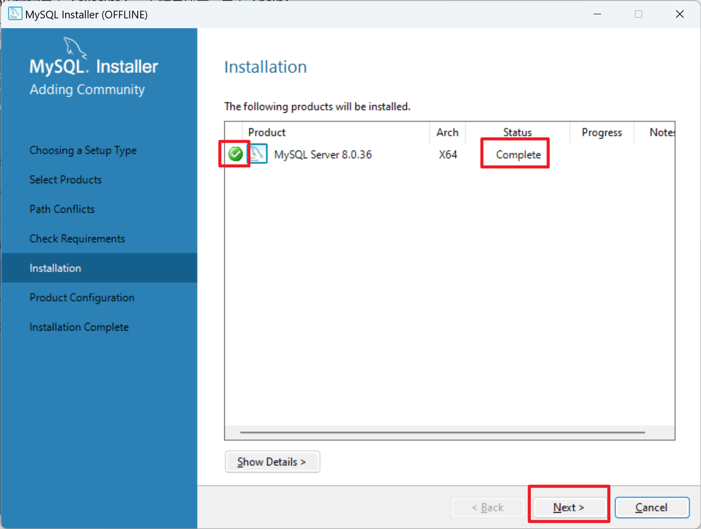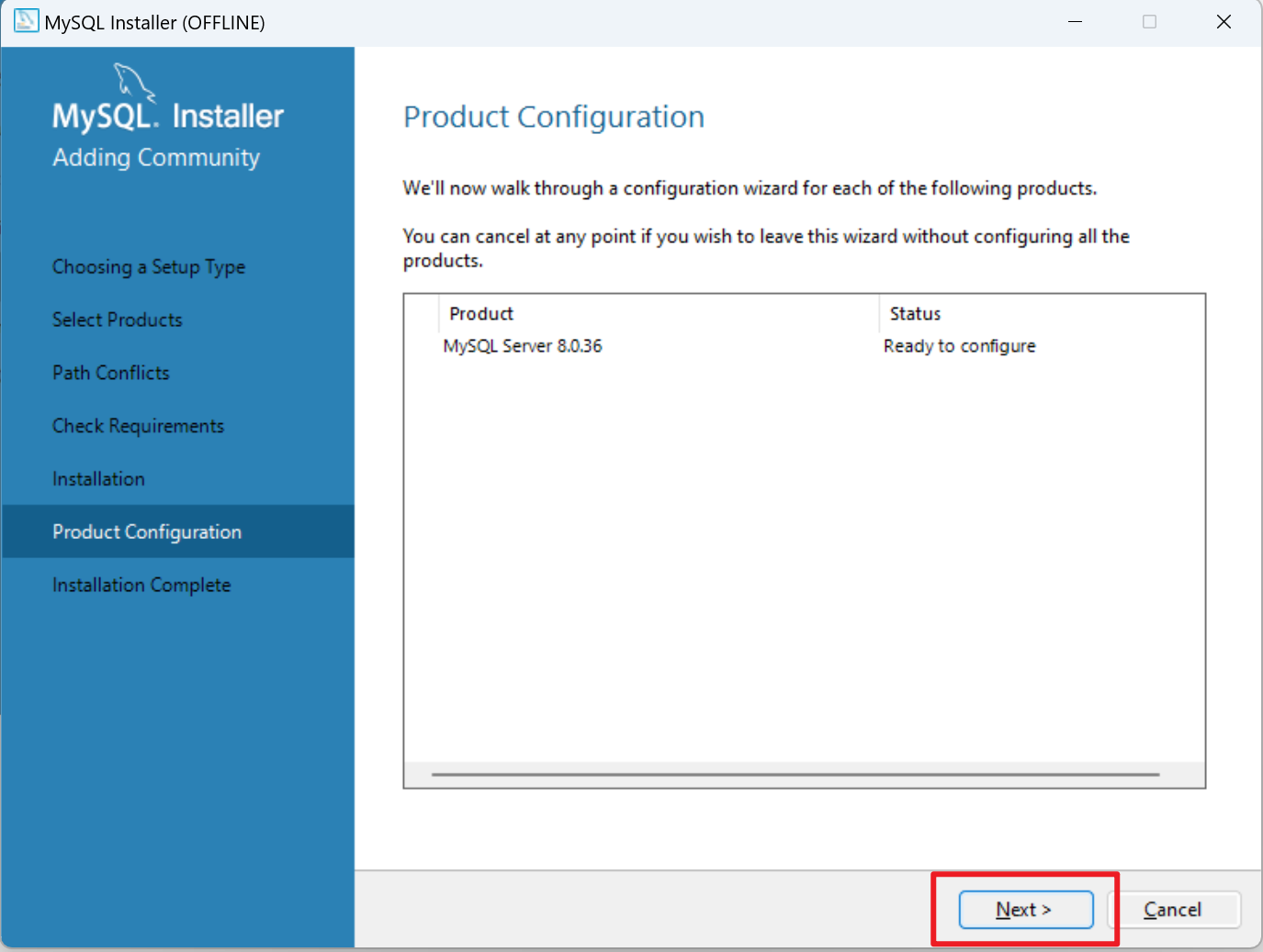 安装成功后,mysql安装指引中,点击【next】