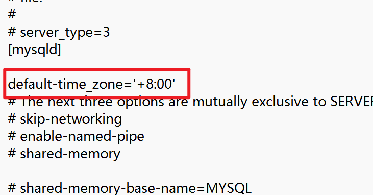 2、使用记事本打开,找到[mysqlld],并添加配置项default-time_zone='+8:00'