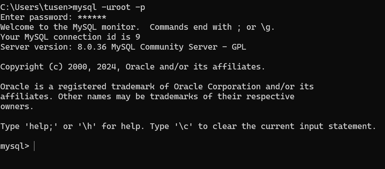 2、输入 mysql -uroot -p,回车后,在密码输入提示中输入安装时填写的密码
