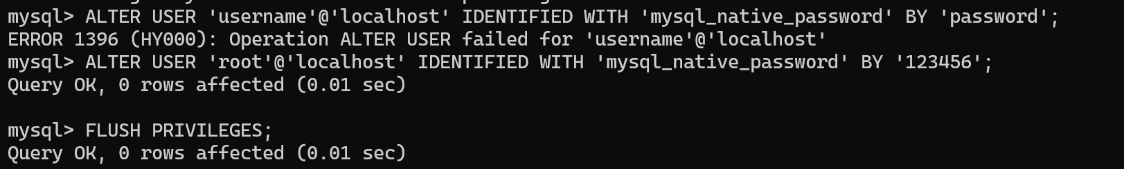 ALTER USER '你的mysql用户名'@'localhost' IDENTIFIED WITH 'mysql_native_password' BY '用户对应的密码';