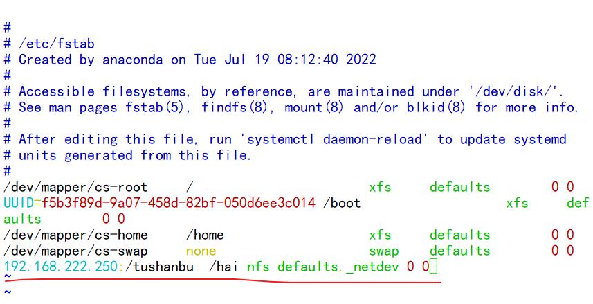 192.168.222.250:/tushanbu nfs4 66G 2.2G 63G 4% /hai