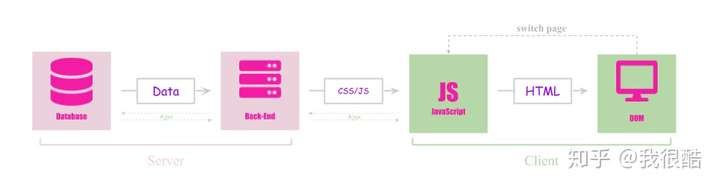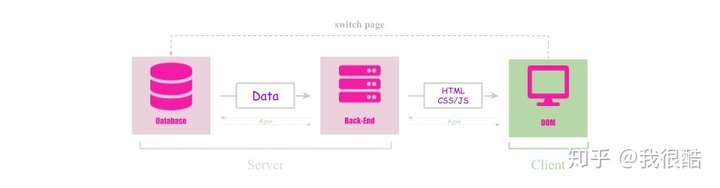 当客户端发起页面请求后,后端收到请求,然后取出数据库中的数据,组装好 HTML,然后返回 HTML 、 CSS 和 JS。有了 Ajax 后,我们在当前页面可以重新获取数据,并更新页面内容。但当我们切换页面,也就是有页面跳转时,整个过程会从头再来一次。