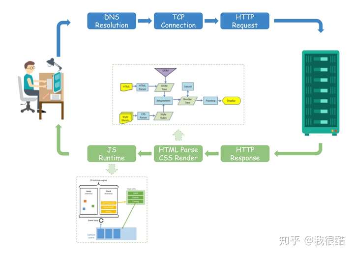 回答这个问题之前,我想起了一道非常经典的前端面试题:“从输入URL到页面呈现在你面前到底发生了什么?”这个题目可以回答的很简单,但仔细思考,也可以回答的很深,这个过程涉及的东西很多。先看一张图: