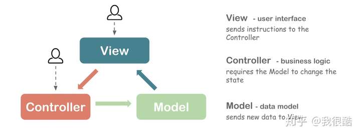 View 作为用户界面,发送指令给 Controller,Controller 要求 Model 改变状态,同时 Model 把更新过的数据发送给 View 反馈给用户。