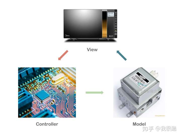 其实生活当中,MVC 的设计思想很多地方都有所体现,以家用微波炉为例,可以将它也理解成三层结构。微波炉的外观以及上面的操作摁钮就是"视图层"(view),而其内部的微波产生装置磁控管则是"数据层"(Model),这里的"数据"可以理解成"核心功能"。把操作摁钮的指令转化为对磁控管的操作则是由“控制器层”的电路板来实现的。