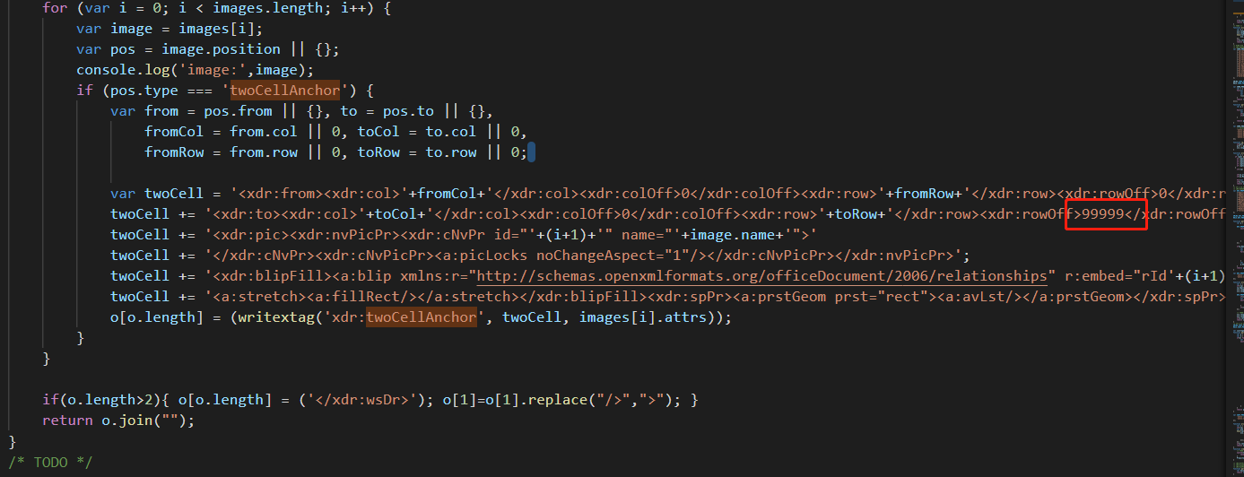 然后去xlsx.js 中发现write_drawing是处理图片, 修改找到图片的对应代码,对应officeXML,发现应该是这个99999导致的超出边框,吧99999改成0,上面的xdr:form里面的rowOff和coloff改成10000 完美的效果