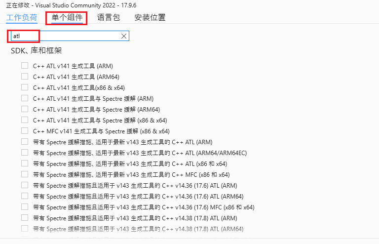 4.找到和项目本版一致的atl类库选中安装(这里我没有装MFC,都是基础类库我就顺手安装了)